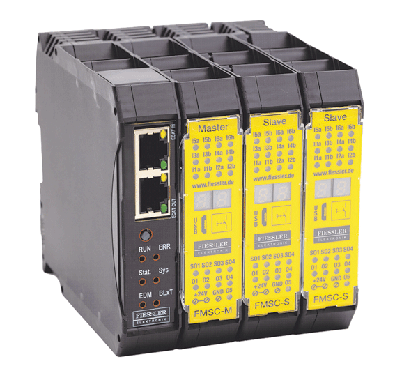 Die Sicherheitssteuerung FMSC, Fiessler Modular Safety Controller, von Fiessler Elektronik zeichnet sich durch ein modulares Konzept aus. Somit kann das Steuerungskonzept flexibel und effizient an die steuerungstechnische Aufgabe angepasst werden. Dazu stehen verschiedene Master- als auch Slavegeräte zur Verfügung.