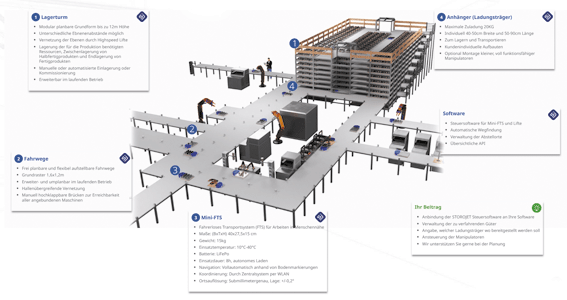 Mit STOROJET steht ein flexibles Automatisierungssystem zur Verfügung, das klassische Förderstrecken in der Produktion sinnvoll ergänzt oder vollständig ersetzt. Der modulare Aufbau erlaubt eine