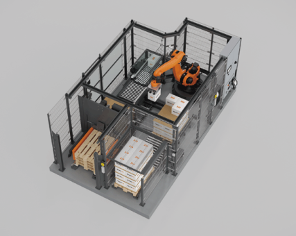Geliefert auf nur zwei Paletten, kommt der mobil verfahrbare Assistenzroboter, der ohne Zaun agieren kann, mit einer Leistung von bis zu 6 Kartons je Minute überall dort zum Einsatz, wo seine