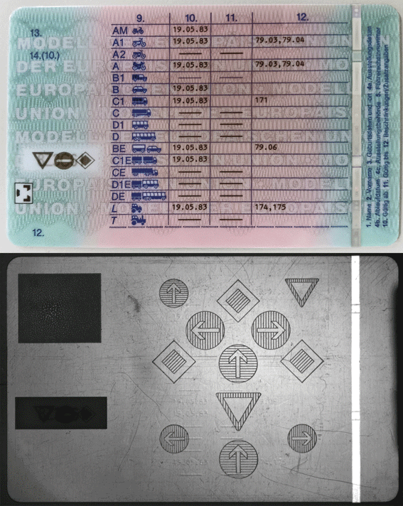 Verschiedenartige Prägungen müssen sichtbar gemacht werden: Hoch- und Tiefprägung mit minimal 10 µm Höhenunterschied zum Trägermaterial und unterschiedlich große und feine Strukturen mit minimalen